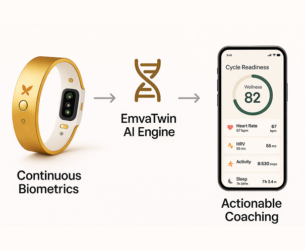 From biometric sensing to emotional awareness — Emva’s hardware and AI work together to understand your unique rhythm.